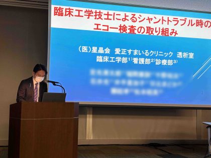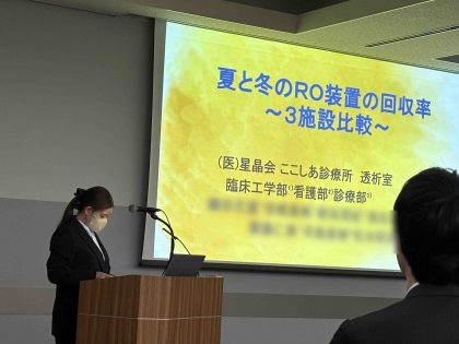 まず、ここしあ診療所の臨床工学技士からは、伊丹市の原水データを活用した水処理装置(RO装置)の効率的な運用管理について、季節変動に伴う回収率の変化に基づいた分析結果を共有しました。また、星優クリニックのリハビリ課サブリーダーからは、患者様の日常生活動作(ADL)向上を目指した「通所リハビリテーションマネジメント」の手法を提言し、治療と生活の質の維持について会場との活発な討論が行われました。さらに、愛正すまいるクリニックの臨床工学技士からは、シャントトラブルの早期発見に寄与する超音波検査技術の習得プロセスを報告し、専門技術の教育体制構築という業界共通の課題についても多くの共感をいただきました。